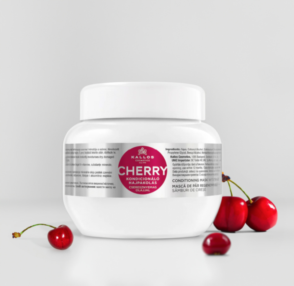 Кондиціонуюча маска для волосся з маслом вишневих кісточок. Тонко текстурованf крем-маска для волосся з вишневим ароматом. Багатий вітамінами А, В1, В2, В6, С і мінералами - фосфором, кальцієм, калієм і високими концентраціями заліза - діюча речовина вишневого масла миттєво зволожує сухі, посічені кінчики.